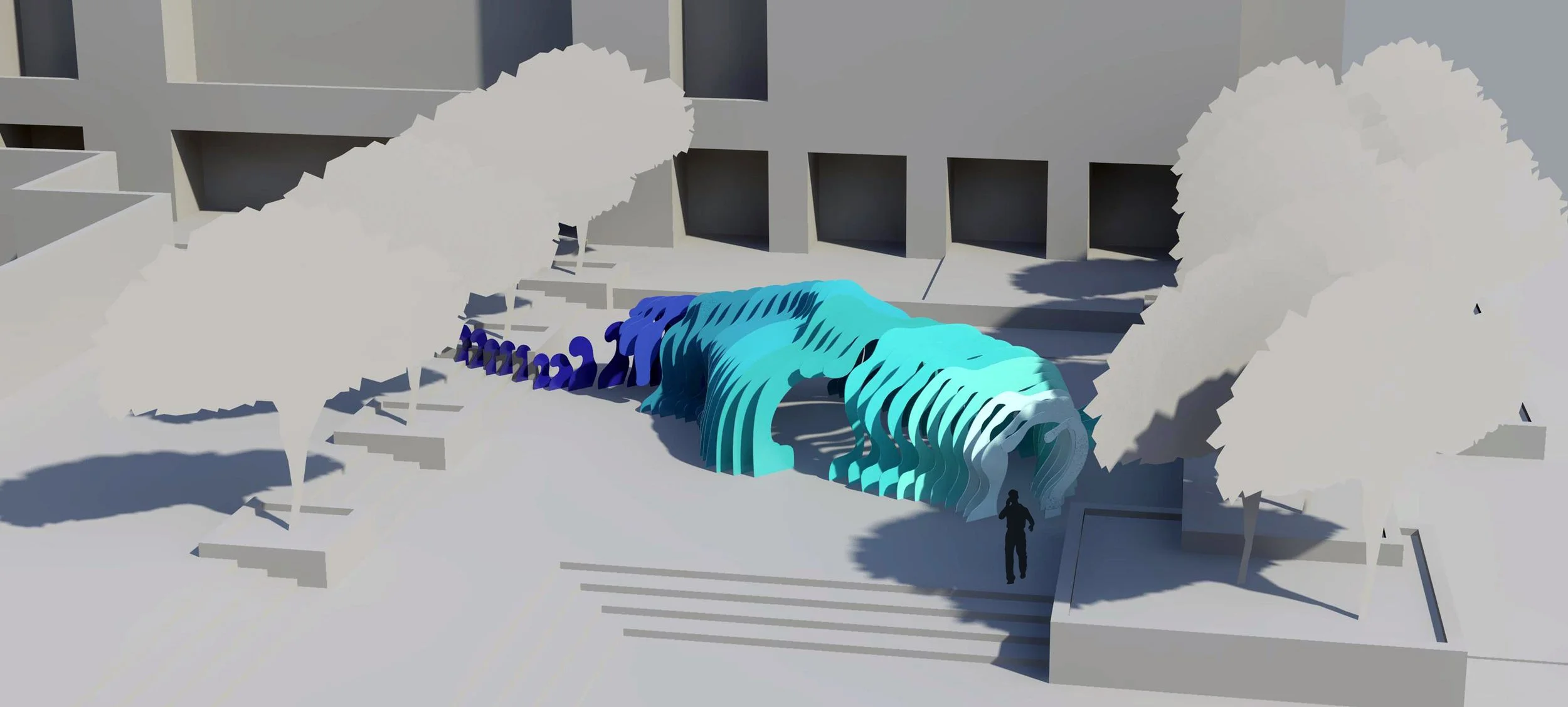 Conceived and constructed by an interdisciplinary team of students, the project reflects a collaboration where diverse academic backgrounds informed structural strategy, fabrication logic, and spatial impact. The resulting undulating blue ribs echo both the folds of the peritoneum and the rhythm of a ribcage forming a dynamic shade structure that brings new life to an underutilized courtyard adjacent to the design and art school.