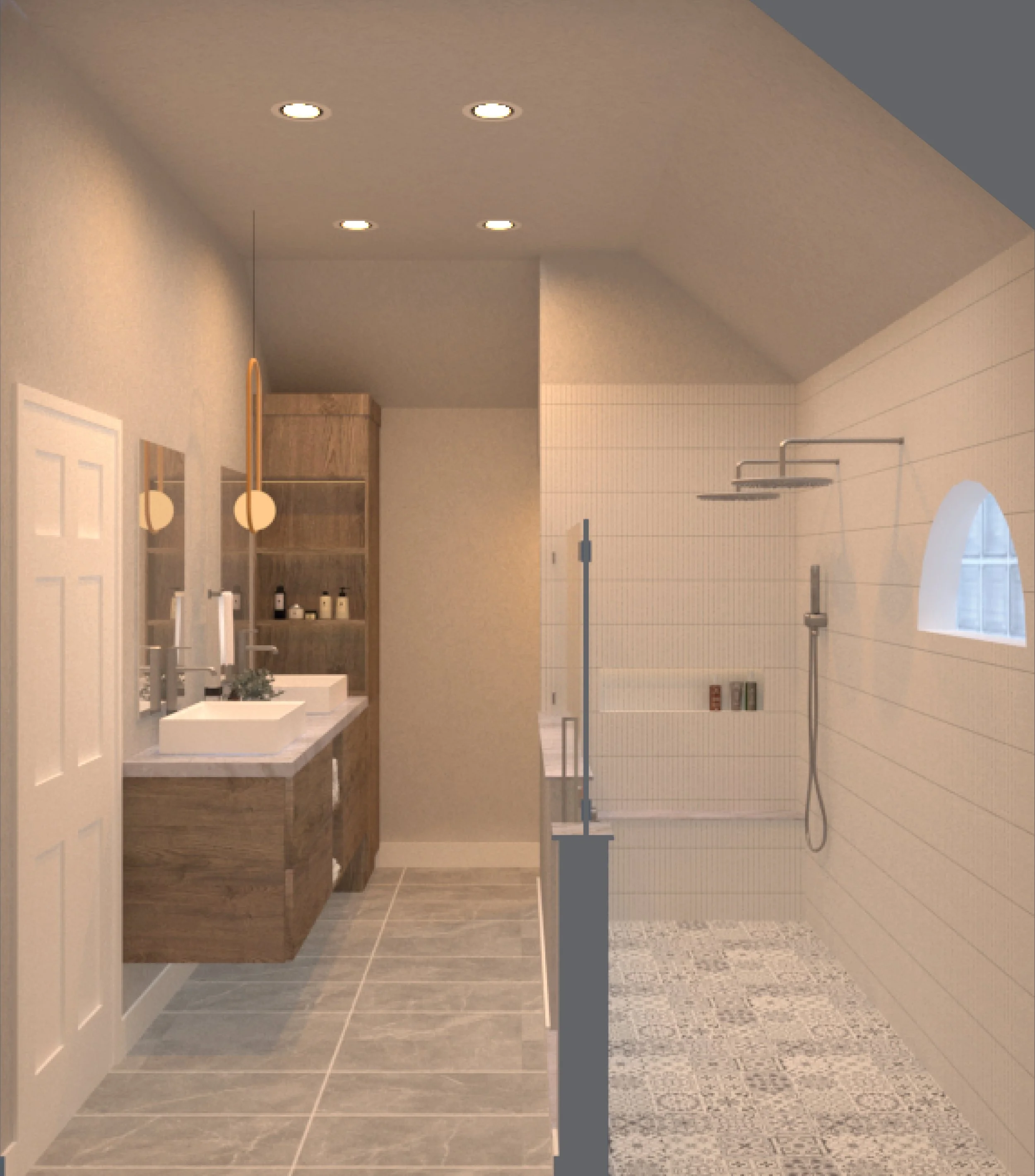 This project involved transforming an outdated and underutilized bathroom into a modern primary suite that the homeowners could take pride in. My role extended beyond simply refreshing finishes. I worked closely with the clients through multiple design iterations, providing renderings to visualize options, guiding them through material selections, and ensuring that every decision aligned with their vision and budget.